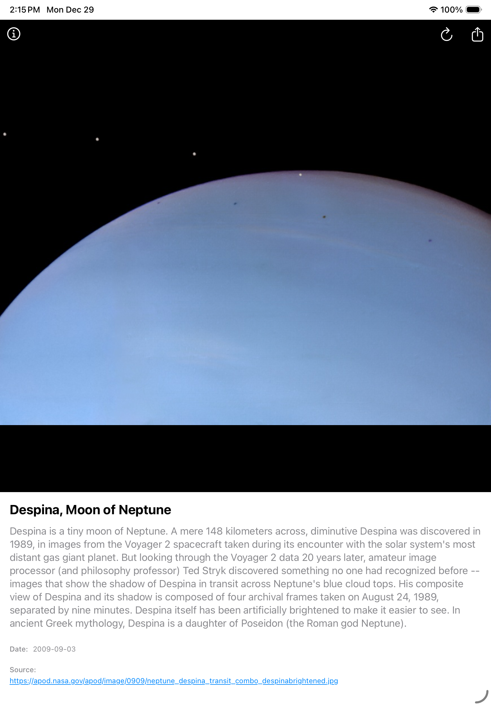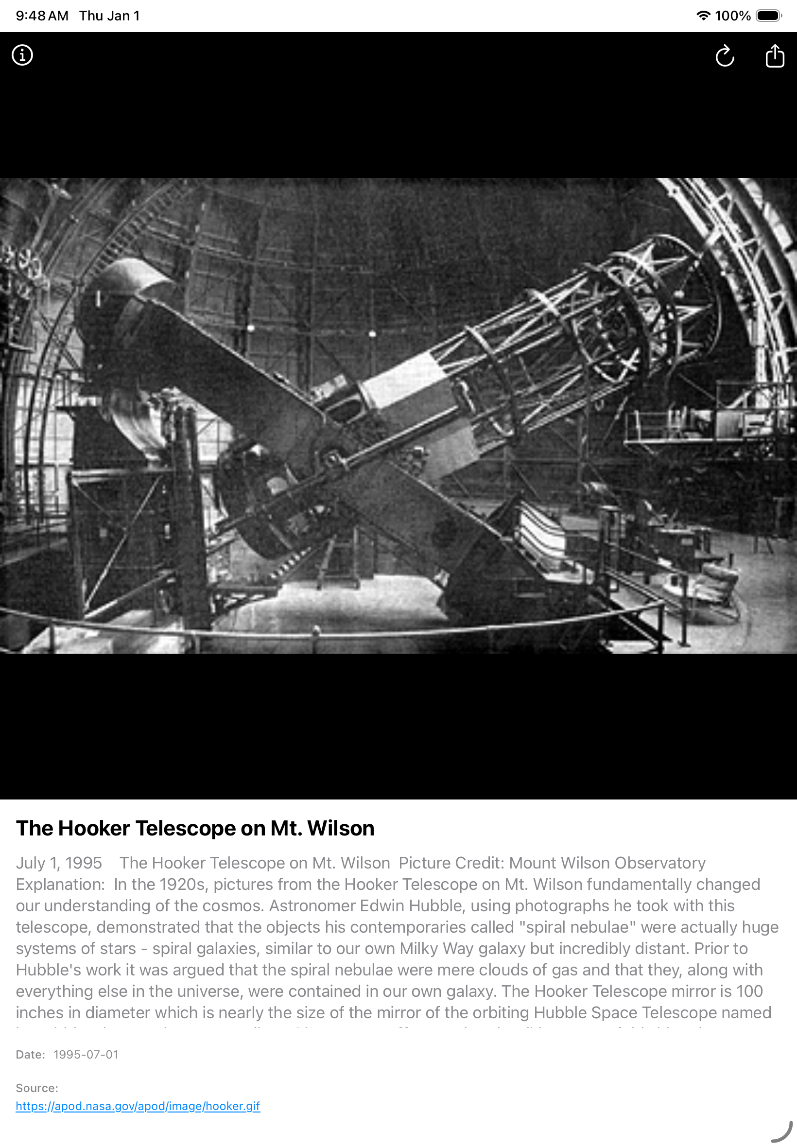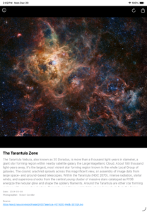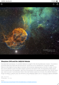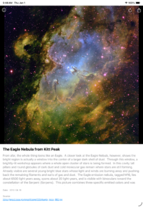 SpaceEXP is designed to stimulate your curiosity and imagination. The App displays random images from NASA’s Picture of the Day along with an expert description of the image. Travel from galaxies to planets, moons, comets, and all manor of off earth phenomena. When an image casts a spell of wonder that you want to share, messages and email are just a tap away. Let a friend know what you feel about a stunning image.