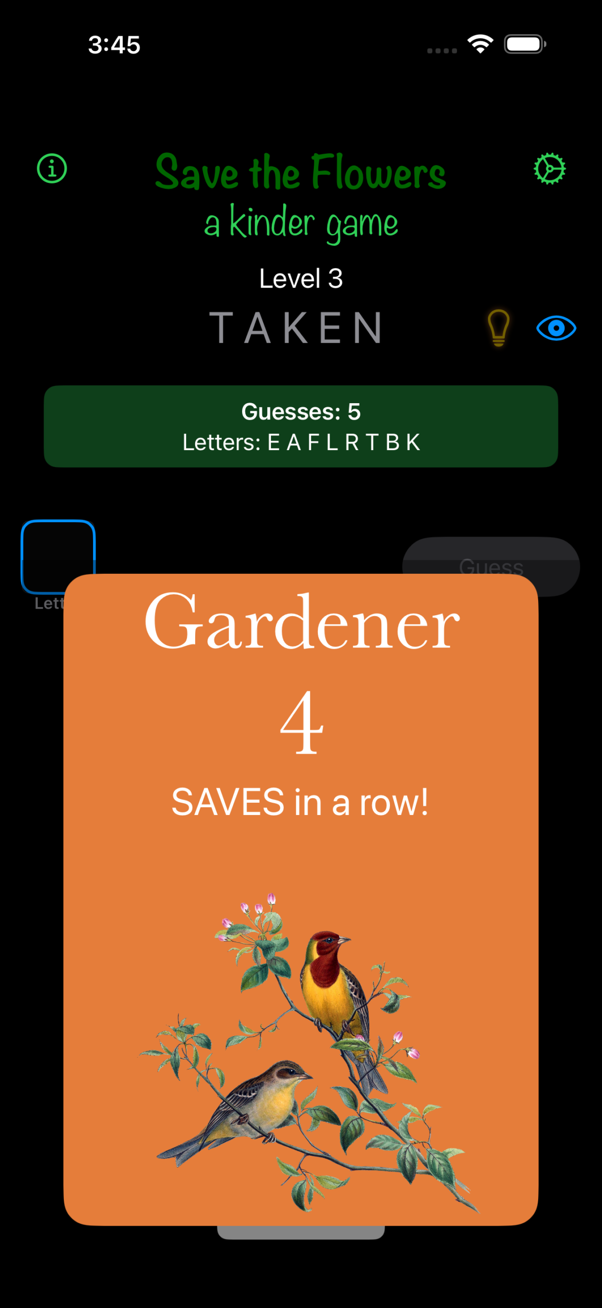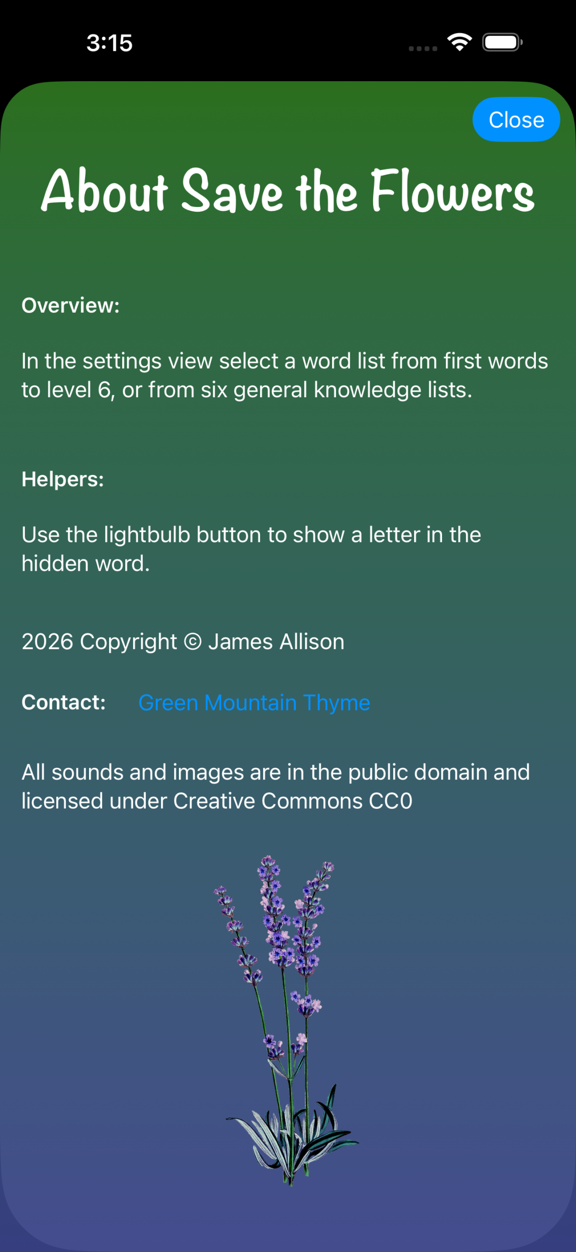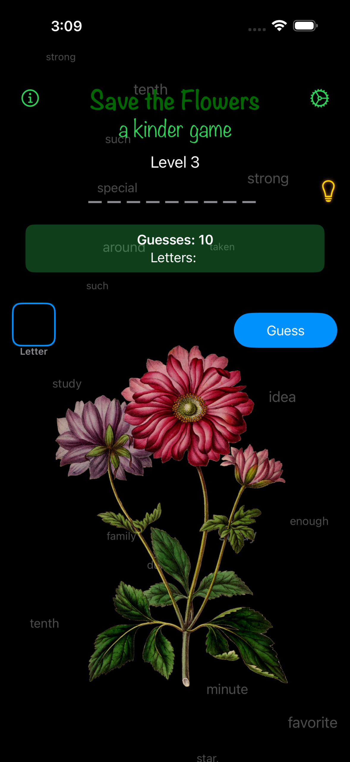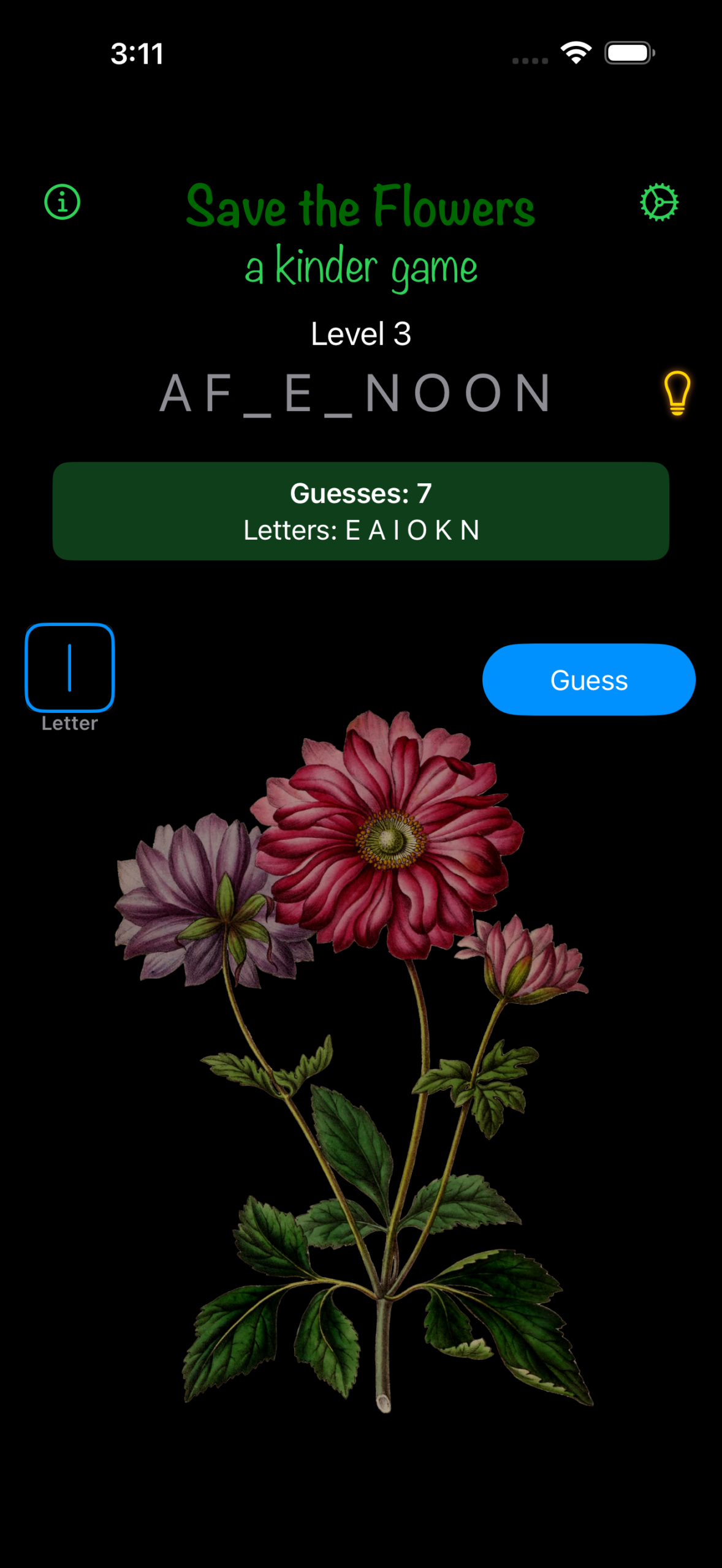 Save the Flowers is a kind, non-violent word game for early readers, students, and lifelong learners. Guess letters, uncover hidden words, and keep your flower blooming in a calm, encouraging experience designed for ages 4 through adults.