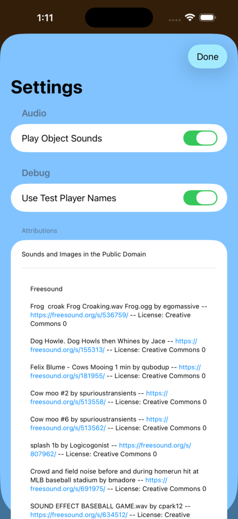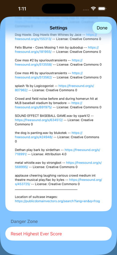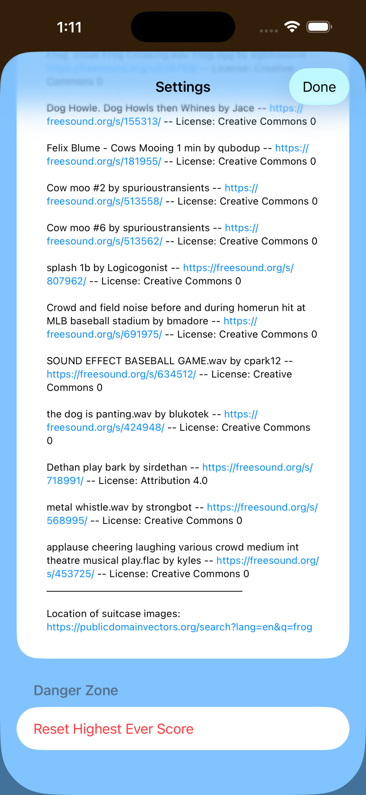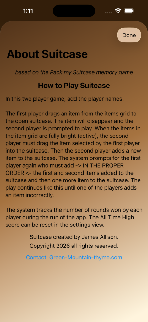 The system tracks the number of rounds won by each player during the run of the app. The All Time High score can be reset in the settings view. A Special celebration awaits a perfect 20 items